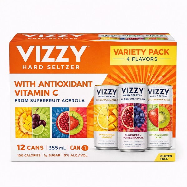 Vizzy Hard Seltzer offers several variety packs, each featuring different dual-fruit flavor combinations and notable for being the first hard seltzer to include Antioxidant Vitamin C from superfruit acerola cherry. All standard Vizzy seltzers have 100 calories and 5% ABV per 12 fl oz can.